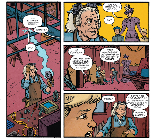 It’s sometime in the late 1800’s, and Doc is still working on making what will eventually become his time traveling train. Meanwhile, Clara and the boys (Jules and Verne) walk in on Doc. It’s at this moment that Doc decides to tell the boys what he’s up to. Getting them Back To The Future!