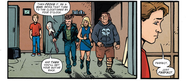 It seems that Needles and his gang/band (The Tabascos) need Marty’s Interocitor Tube for their amp. In the process of trying to steal Marty’s (after Marty kindly offers to rent it out to them for 5 bucks lol), it gets dropped and shattered. Needles and his gang then instruct Marty to steal them another one, or else he gets beat up! Marty declines…..until they call him chicken. Nobody calls him chicken! They then tell Marty he has till 4pm to meet them by the clock tower with the tube, and as a good measure, they take Marty’s guitar hostage.