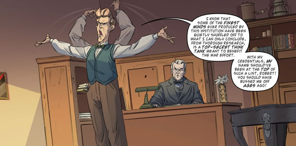 This is a story that looks at a young Doc Brown, and it takes place in 1943 at the California Institute Of Technology. Doc is seen busting into Robert’s office (The Dean Of The College) and proclaiming he knows he has been left out of the selection of men to be a part of a major think tank!