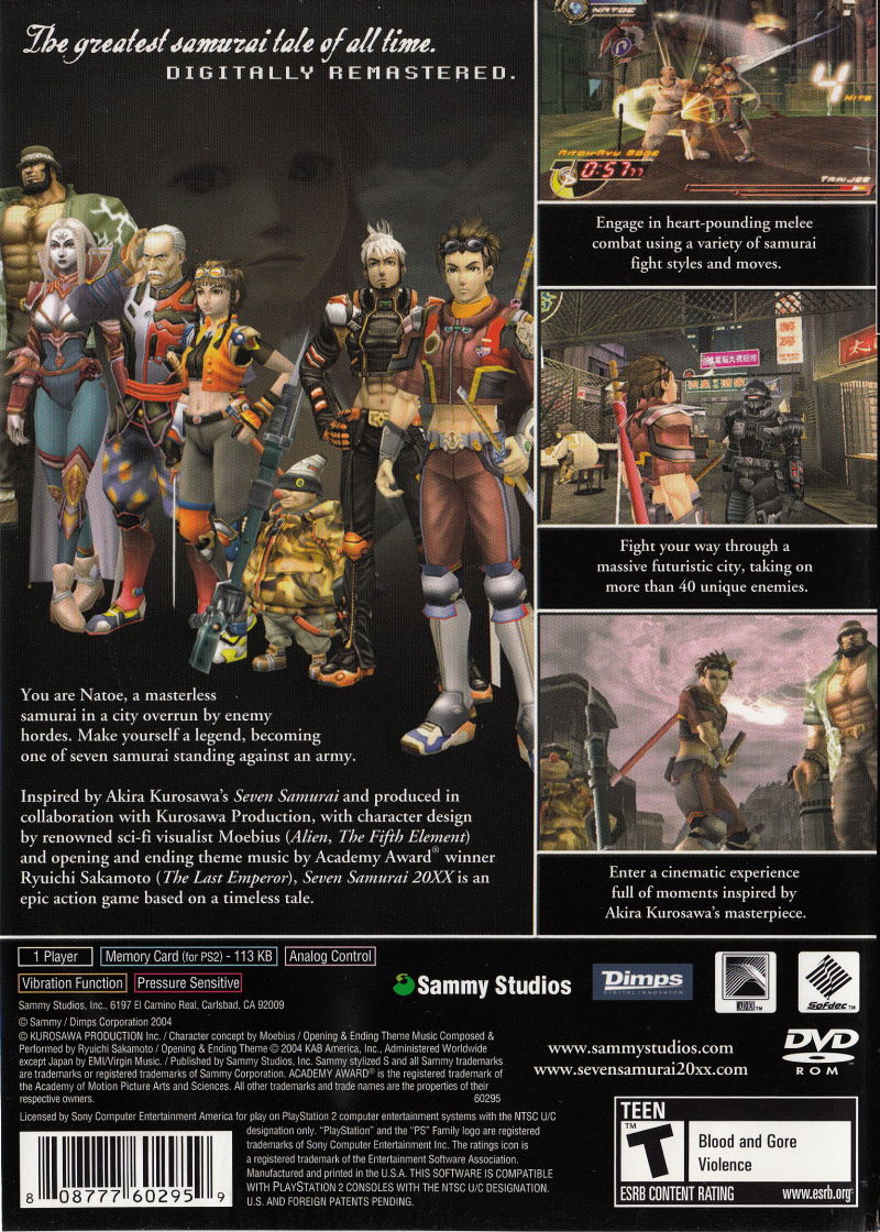 Seven Samurai 20XX was a PlayStation 2 game released by Sammy Studios in North America on March 12th, 2004. Its story and concept are based upon Akira Kurosawa’s 1954 movie Seven Samurai.