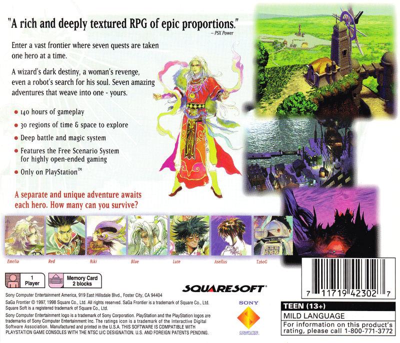 SaGa Frontier was a role-playing video game developed by Square for the PlayStation and released in North America on March 25th, 1998. It is the seventh game in the SaGa series and the first to be released on the PlayStation.
