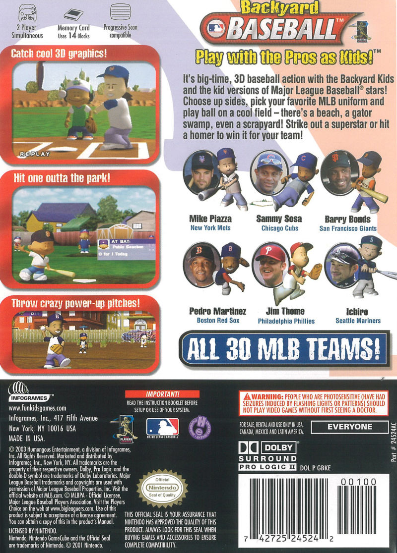 Backyard Baseball is a series of baseball video games for children which was developed by Humongous Entertainment and published by Atari. It was first released in October 1997 for Macintosh and Microsoft Windows. Later games were featured on Game Boy Advance, PlayStation 2, GameCube, Wii, and iOS. There have been eleven different versions of the game since 1997. It was released for GameCube In the USA on April 2nd, 2003.