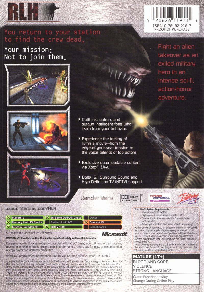Run Like Hell (also known as RLH) was a third-person shooter video game developed by Digital Mayhem, published by Interplay Entertainment and distributed by Avalon Interactive for Xbox in North America on April 9th, 2003.