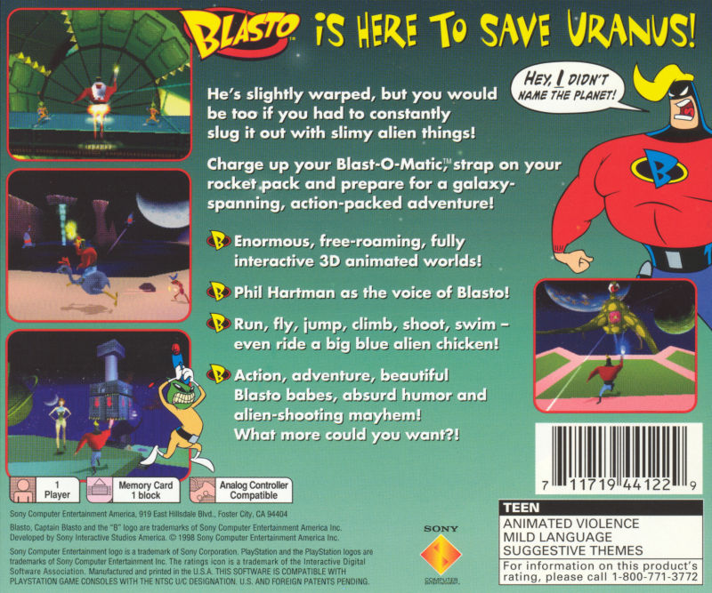 Blasto was a third-person action/platformer/shooter game developed by Sony Interactive and published by Sony Computer Entertainment America for the Sony PlayStation in North America on April 15th, 1998. Phil Hartman had voiced Captain Blasto, an extremely muscular, alien-fighting, dimwitted captain who’s always in the mood for a babe from any solar system most specifically in the Planet Uranus.