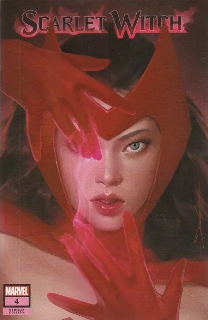 From Marvel comics, I collect for my two favorite badass fictional women… She-Hulk and the Scarlet Witch. This week saw the release of Scarlet Witch, Vol. 3 #4. This series has proven to be a big seller and popular title since it started in January of this year. It’s to be completely expected that there will continue to be variants for this series, and many of them to boot! Imagine my joyful surprise and simultaneous sense of financial dread when I saw that I was getting 4 variants from my local comic shop, and it included a 1:50 variant! I have never gotten a cover that rare/hard to find, and though the cost wasn’t the prettiest, I went for it!