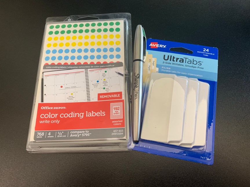 A trip to my local office supply store, and a few dollars later, I had the items I needed to make shelving my books easy. The tabs are peel and stick and can be used multiple times (more on that in a minute), the colored dots gave me enough different colors to cover the main big publishers (Marvel, DC, etc.) and a simple sharpie pen (though any pen will do).