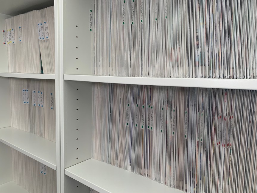 Seeing all of the colors of the comics peaking out and tabs all lined up really appeals to me. Selecting something to read is also super easy. No longer do I have to sort through boxes, or move boxes to get into other boxes. I tried the long boxes once that were drawer style, but they just didn’t feel right to me at all. So shelved and tabbed it was. Tabs by the way were a very cheap solution and it only required 3 things.