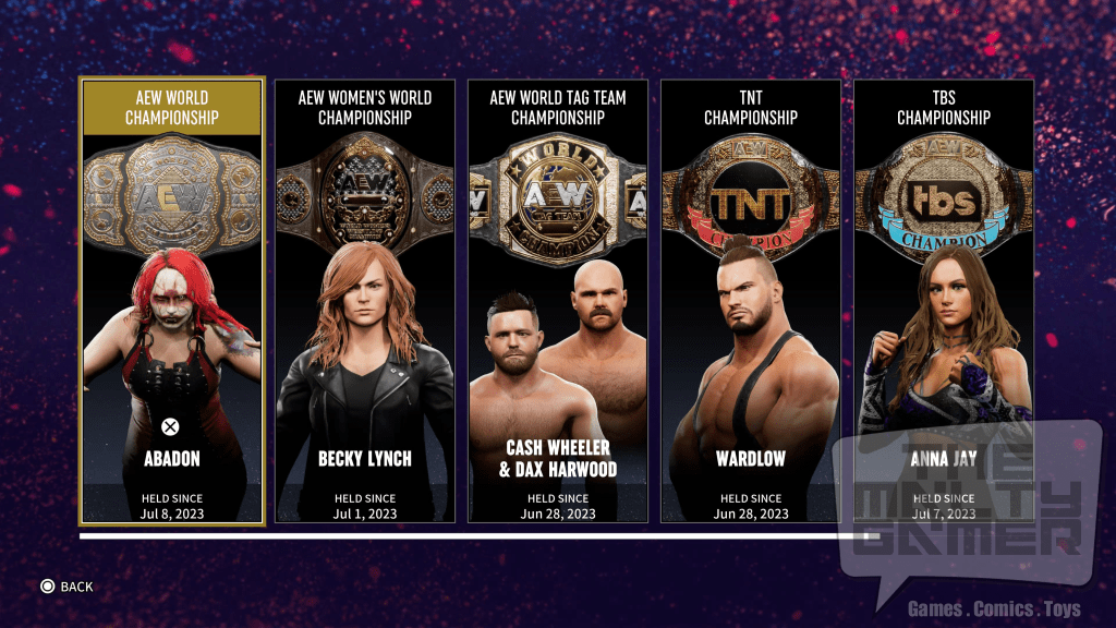 - First step is to go your settings from the main menu screen (I am on a PS5, so that’s the Triangle Button for me), and select Championship Management. You have to put the Men’s AEW World Heavyweight Championship on one of the 2 wrestlers you want the gold costume unlocked for. I am starting alphabetically through the roster, so I am putting the belt on Abadon. Yes it has to be the Men’s belt, and yes the women of AEW can hold/defend that title. AEW is so weird sometimes lol