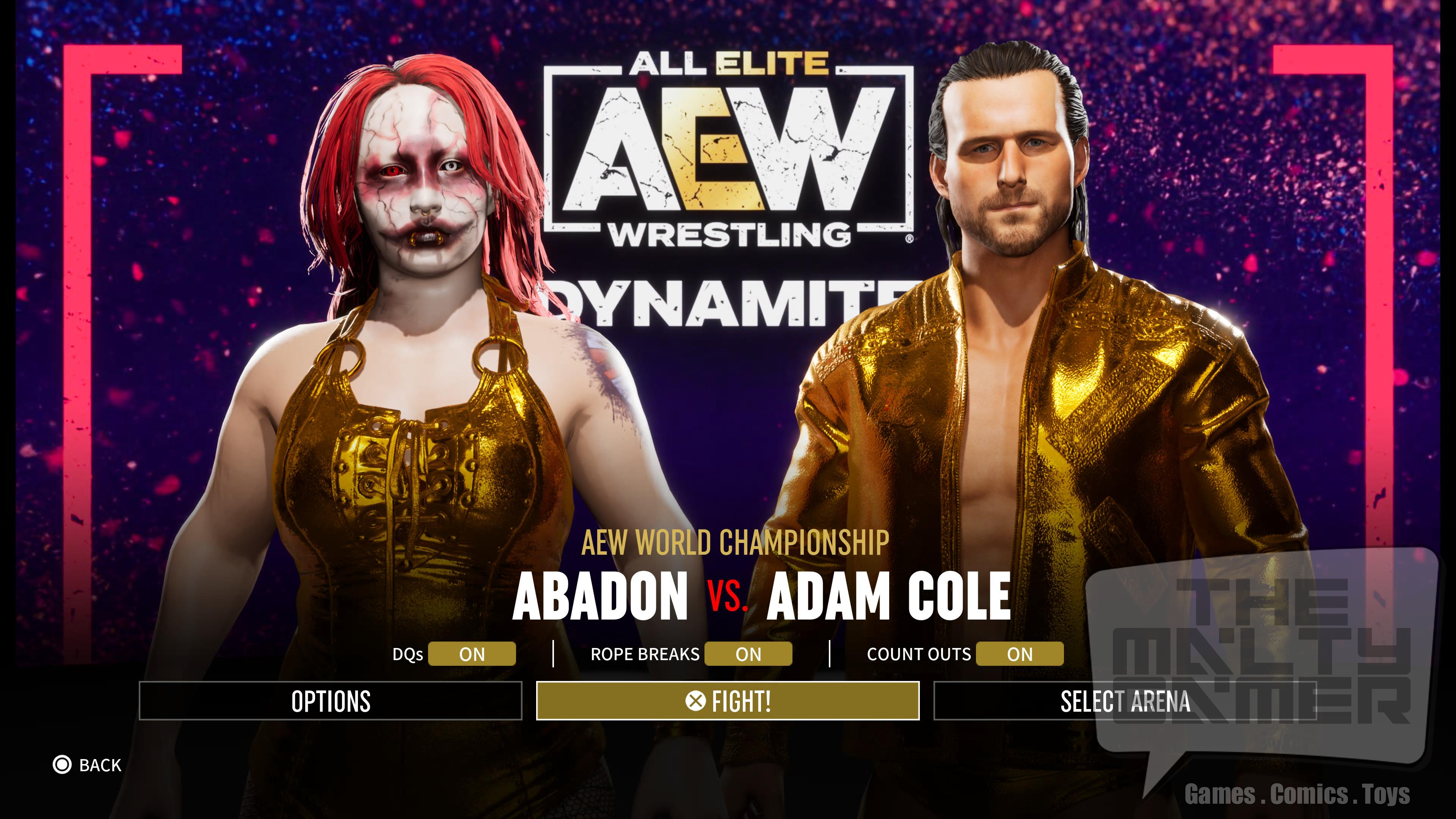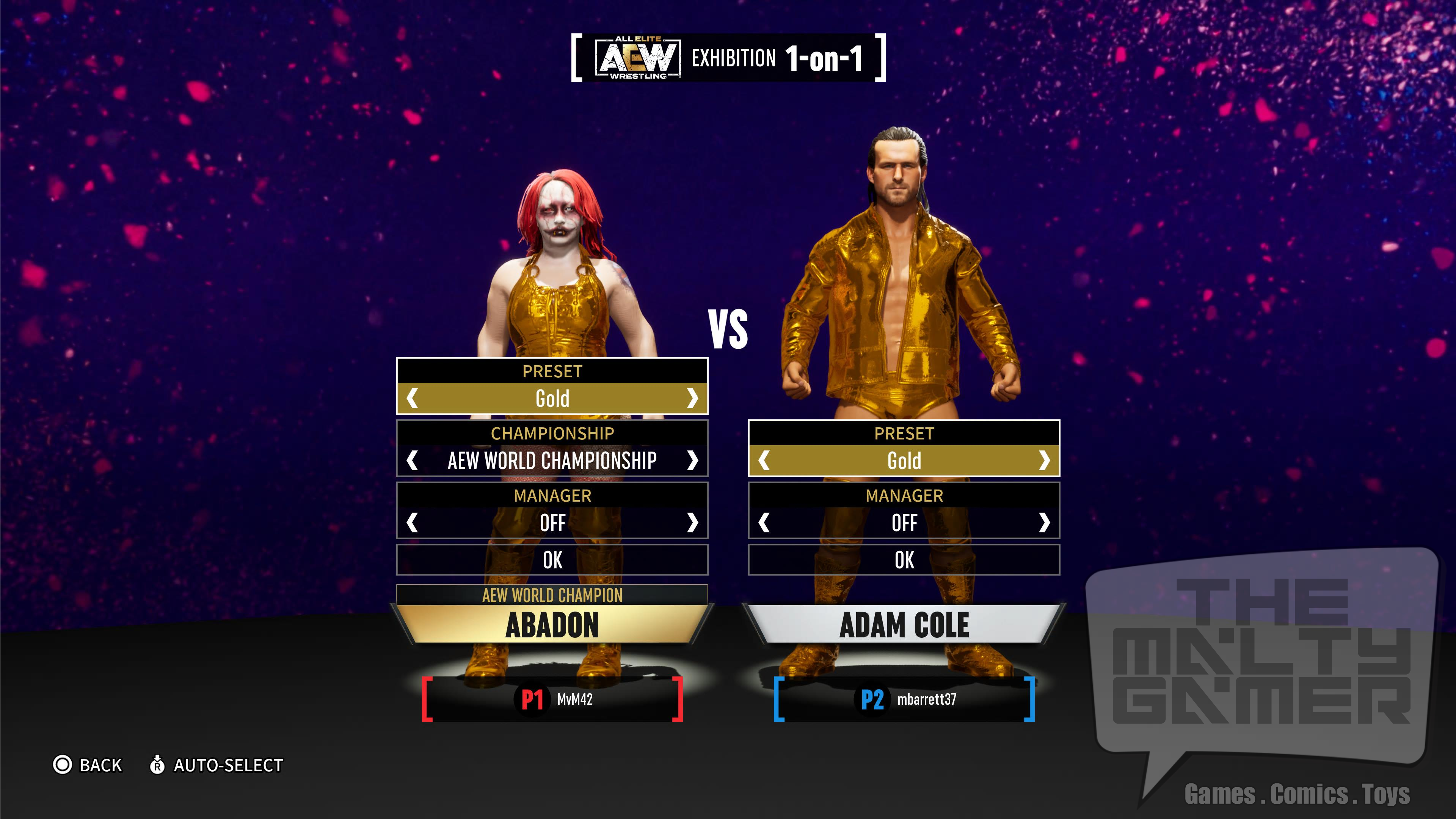 - With both controllers set as a local player (not COM), have player 1 be Abadon, and player 2 be Adam Cole. You can use any wrestler you want for player 2, but as I am trying to stay alphabetical through this whole process, so I went with Adam Cole.